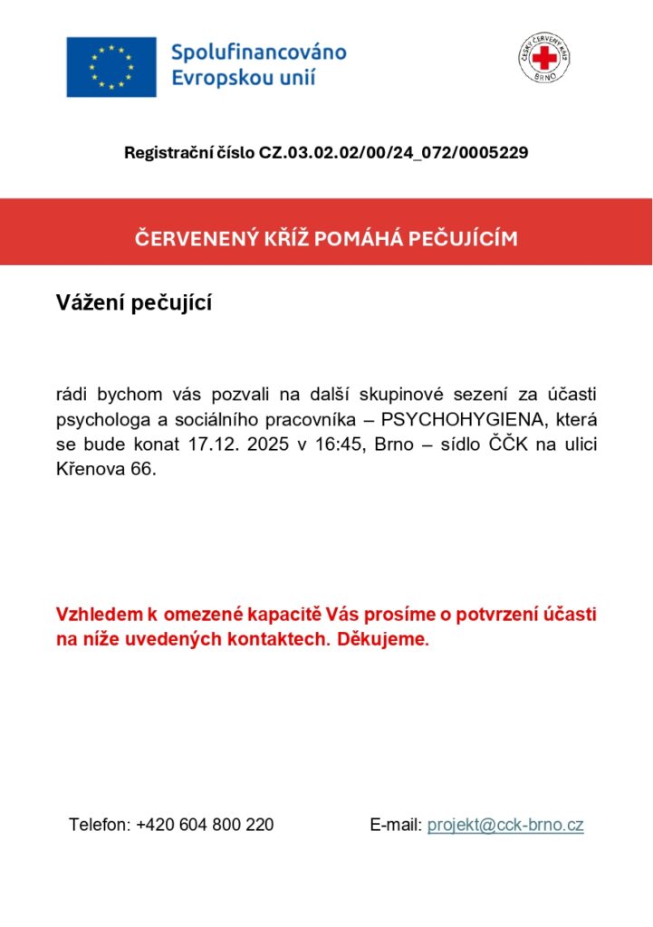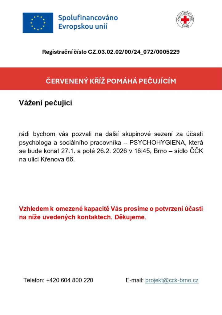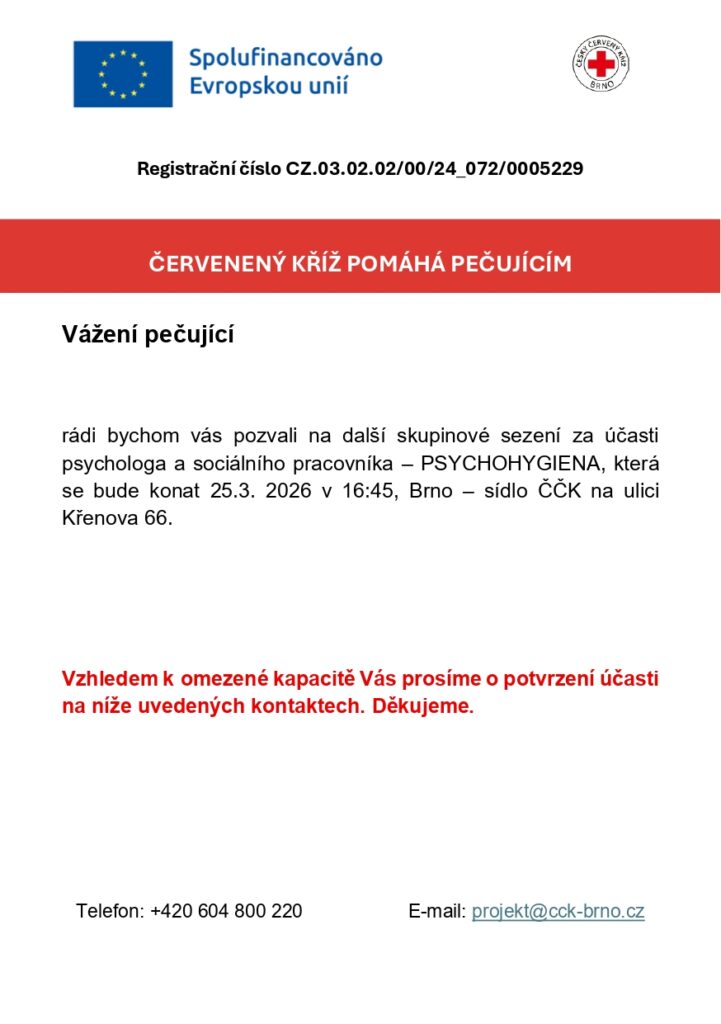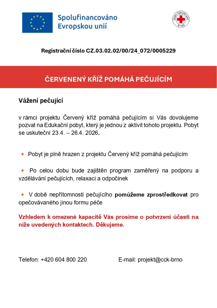 Oblastní spolek Českého červeného kříže Brno spustil projekt, který Vám, pečujícím, pomůže získat znalosti, odpočinek a rozhled.