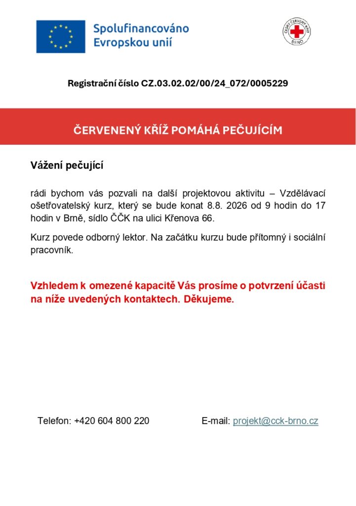 Projekt „Červený kříž pomáhá pečujícím“ (CZ.03.02.02/00/24_072/0005229) je spolufinancován Evropskou unií v rámci Operačního programu Zaměstnanost Plus (OPZ+). Díky této podpoře nabízíme aktivity, které se zaměřují na zlepšení kvality života pečujícího a získání praktických dovedností v oblasti ošetřovatelské péče.